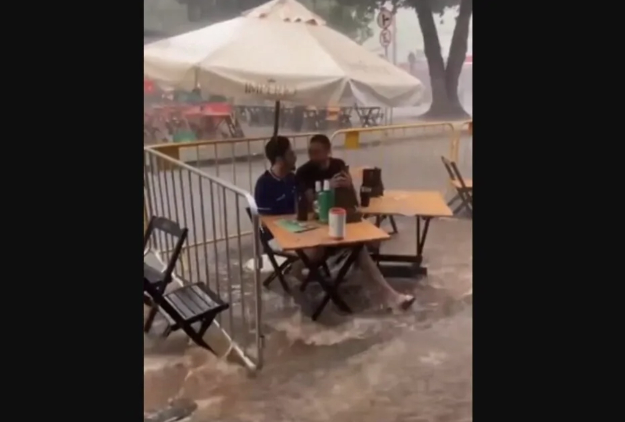 Com cerveja gelada na mesa e a TV ligada na Copa do Mundo, o temporal e a enxurrada nos pés são apenas um detalhe, principalmente na “capital dos bares”: foi o que pensaram os dois amigos que aparecem em um vídeo que viralizou nas redes sociais no último fim de semana.
