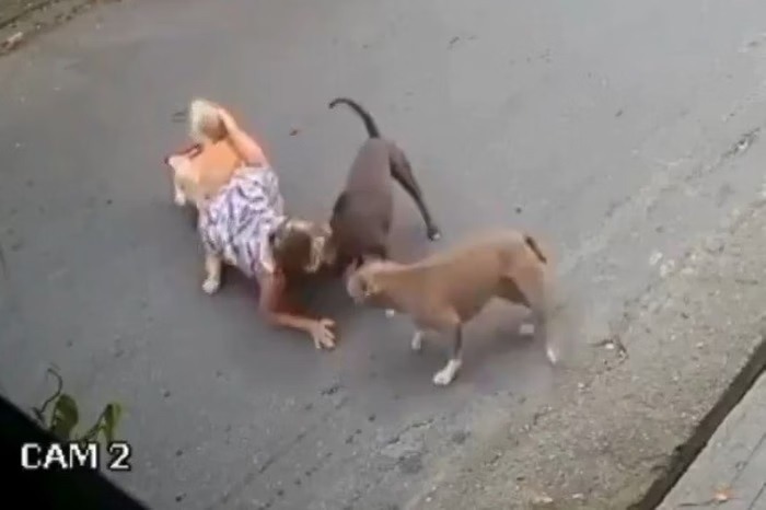 Uma mulher grávida de sete meses caiu no meio da rua ao defender seu cão de dois cachorros da raça pit monster, em Santos, no litoral de São Paulo, na última quinta-feira (24).