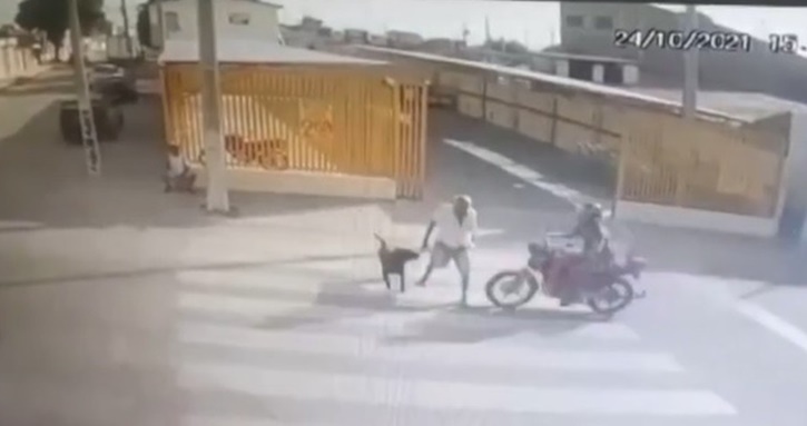 O idoso atravessava a rua na faixa, segurando o cachorro, quando foi atingido pela moto. As imagens do acidente foram registradas por câmeras de segurança.