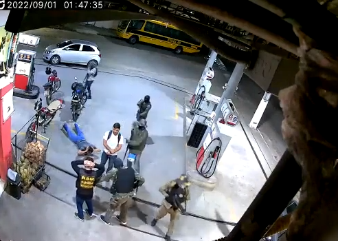 O relógio marcava 1h47 da madrugada desta quinta-feira (1º) quando os criminosos chegaram em dois veículos. Pelo menos sete criminosos aparecem nas imagens. Durante a ação, as vítimas são revistadas e obrigadas a deitar no chão.