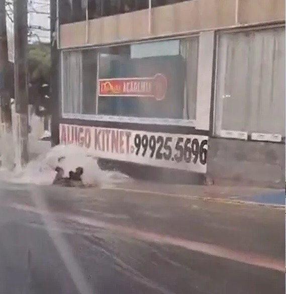 O registro mostra uma mulher sendo levada pela força da água, que desce com velocidade devido ao alto volume de precipitação acumulado.