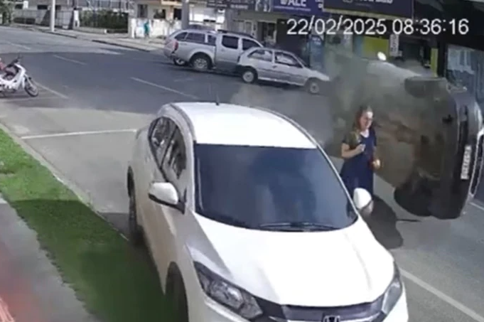 VÍDEO: Mulher escapa de acidente impressionante entre dois veículos em SC