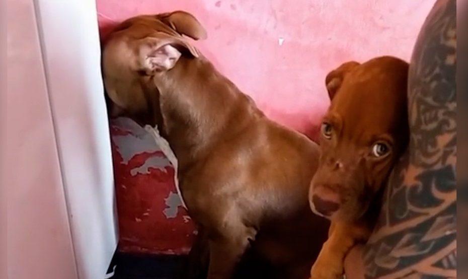 No vídeo, o cachorro se encosta na parede e ‘vira a cara’ para o tutor, Antônio João, porque, aparentemente, não teria gostado dele ter dado mais atenção a outra pitbull que chegou há apenas duas semanas na família, a Safira.