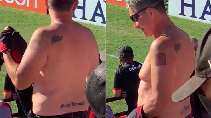 A tatuagem com o título do livro de Hitler foi vista nas costas do homem, que ainda não foi identificado. Ele também trazia no braço o símbolo de uma cruz, parecida com a Cruz de Ferro, outro símbolo usado pelo exército nazista na primeira metade do século passado. Em nota, o Brasil confirmou o incidente e elogiou a iniciativa da torcida de expulsar o homem tatuado.