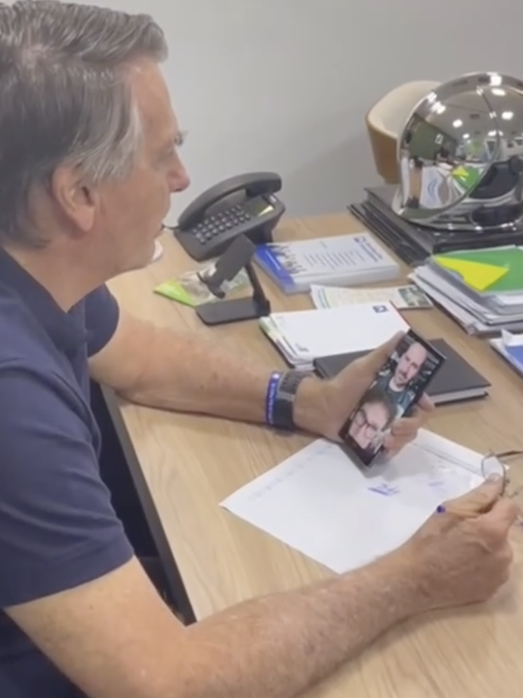 O filho do ex-presidente brasileiro, deputado federal Eduardo Nantes Bolsonaro, o 03, é o terceiro filho de Jair Bolsonaro, também participou da videochamada.