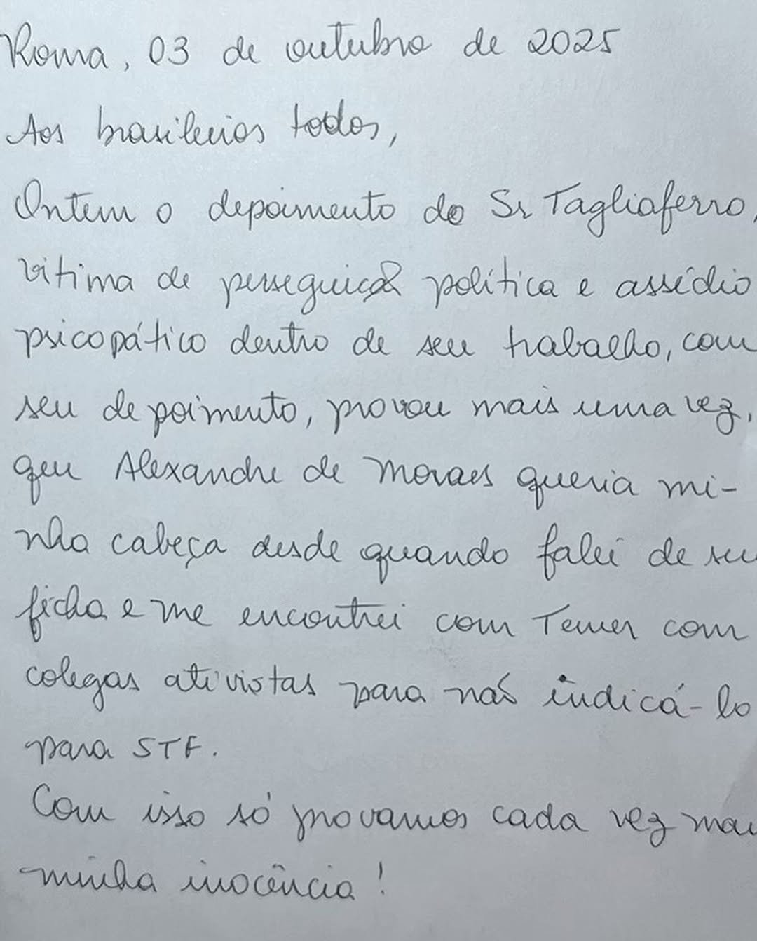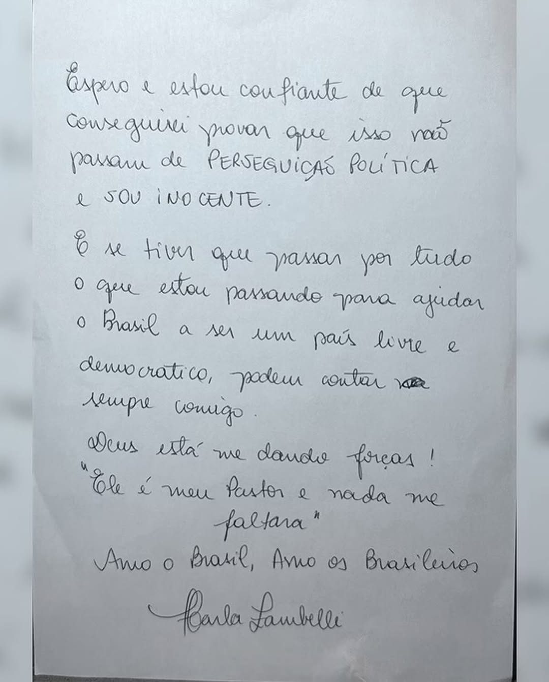 Obtida pela coluna Paulo Cappelli, a carta de Zambelli foi redigida na quarta-feira (3/9). A deputada foi condenada pelo STF a 10 anos de prisão e à perda do mandato invasão ao sistema do Conselho Nacional de Justiça (CNJ).