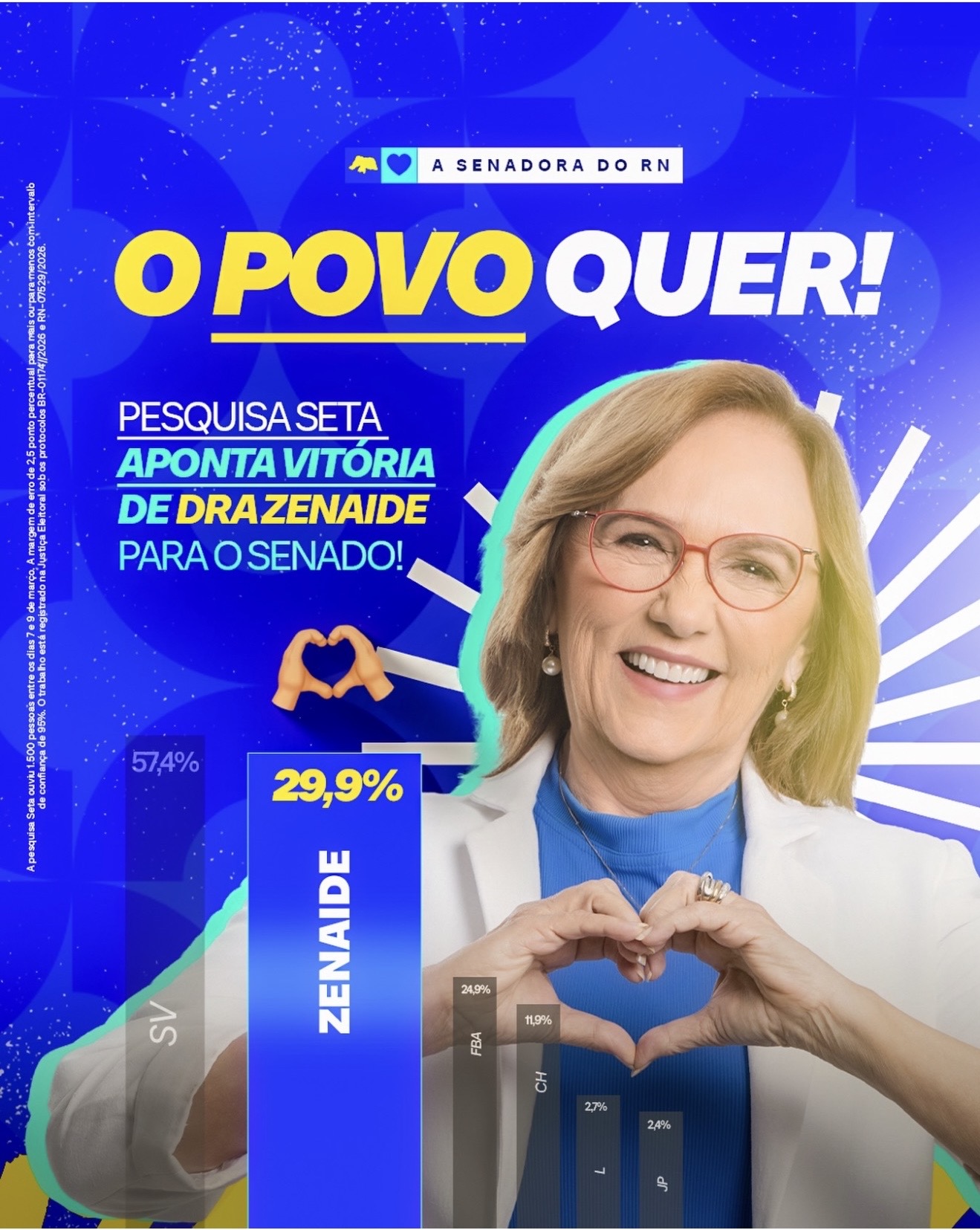 A senadora Zenaide Maia comemorou o resultado da pesquisa Seta que a coloca em posição confortável na disputa pelo Senado no Rio Grande do Norte. De acordo com o levantamento divulgado no banner, a parlamentar aparece com 29,9% das intenções de voto, ocupando a segunda colocação na corrida eleitoral.